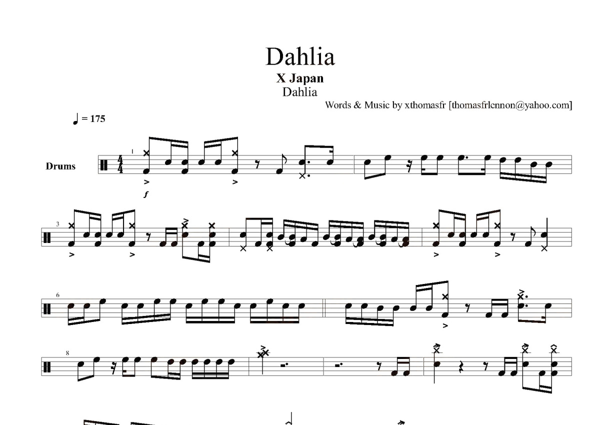 《Dahlia》是X-Japan演唱的一首歌曲,这份鼓谱共有十张高清图谱,图谱由 @打鼓谱 编配上传,图谱使用五线谱编配,使用这份Dahlia架子鼓谱,你将能够轻松地敲打出这首X-Japan的Dahlia,快来尝试吧。《Dahlia》是由日本著名乐队X-Japan于1996年11月4日发行的第五张大碟,也是X-Japan最后一张录音室专辑。该专辑共收录11歌曲。