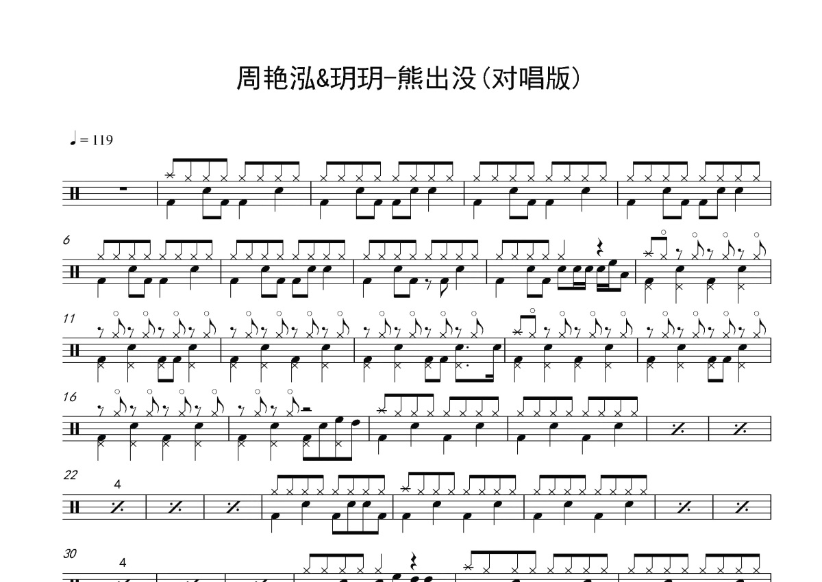《熊出没》是周艳泓/玥玥演唱的一首歌曲,对唱版,这份鼓谱共有两张高清图谱,图谱由 @打鼓谱 编配上传,图谱使用五线谱编配,使用这份熊出没架子鼓谱,你将能够轻松地敲打出这首周艳泓/玥玥的熊出没,快来尝试吧。周艳泓&玥玥-熊出没(对唱版)稍改版。