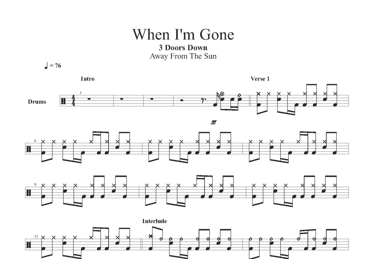 《When I'm Gone》是3 Doors Down演唱的一首歌曲,这份鼓谱共有三张高清图谱,图谱由 @打鼓谱 编配上传,图谱使用五线谱编配,使用这份When I'm Gone架子鼓谱,你将能够轻松地敲打出这首3 Doors Down的When I'm Gone,快来尝试吧。3Doors Down来自美国密西西比洲比洛克西城(Biloxi)附近的小镇Escatawpa,他们是靠着一首成名单曲和很多在当地受欢迎的现场演唱会而逐渐走红的。由Brad Arnold (主唱,1978年12月27日出生),Todd Harrell (贝司手),Matt Roberts(吉他手),Chris Henderson (吉他手)和Daniel Adair (鼓手)组成。