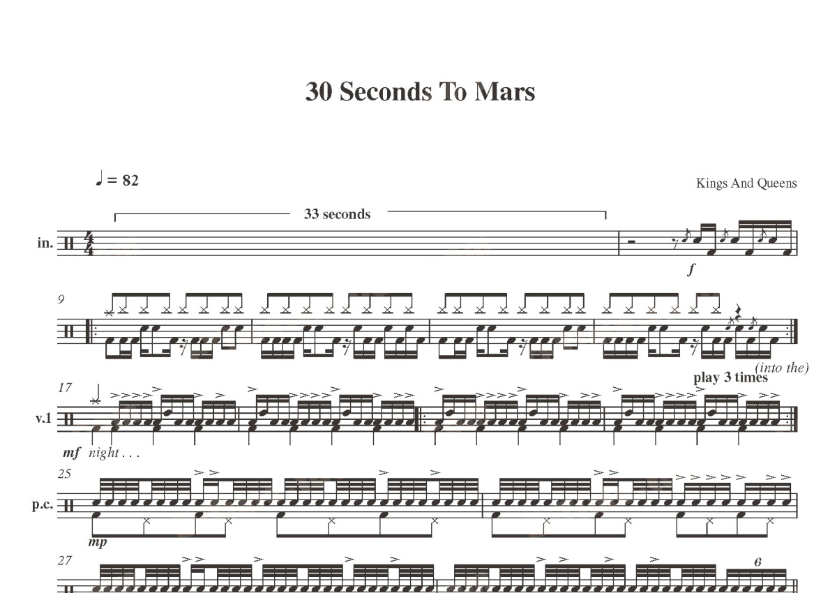 《Kings and queens》是30 Seconds to Mars演唱的一首歌曲,这份鼓谱共有两张高清图谱,图谱由 @打鼓谱 编配上传,图谱使用五线谱编配,使用这份Kings and queens架子鼓谱,你将能够轻松地敲打出这首30 Seconds to Mars的Kings and queens,快来尝试吧。30秒上火星(30 Seconds To Mars)是一组来自美国加利福尼亚州洛杉矶的摇滚乐队,组建于1998年,由乐队主唱、吉他、贝斯、键盘手杰瑞德·莱托以及他的哥哥,鼓手夏农·莱托组成。