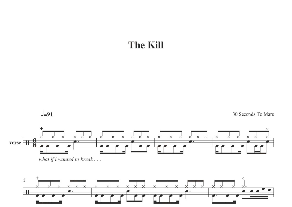 《The Kill》是30 Seconds to Mars演唱的一首歌曲,这份鼓谱共有三张高清图谱,图谱由 @打鼓谱 编配上传,图谱使用五线谱编配,使用这份The Kill架子鼓谱,你将能够轻松地敲打出这首30 Seconds to Mars的The Kill,快来尝试吧。30秒上火星(30 Seconds To Mars)是一组来自美国加利福尼亚州洛杉矶的摇滚乐队,组建于1998年,由乐队主唱、吉他、贝斯、键盘手杰瑞德·莱托以及他的哥哥,鼓手夏农·莱托组成。