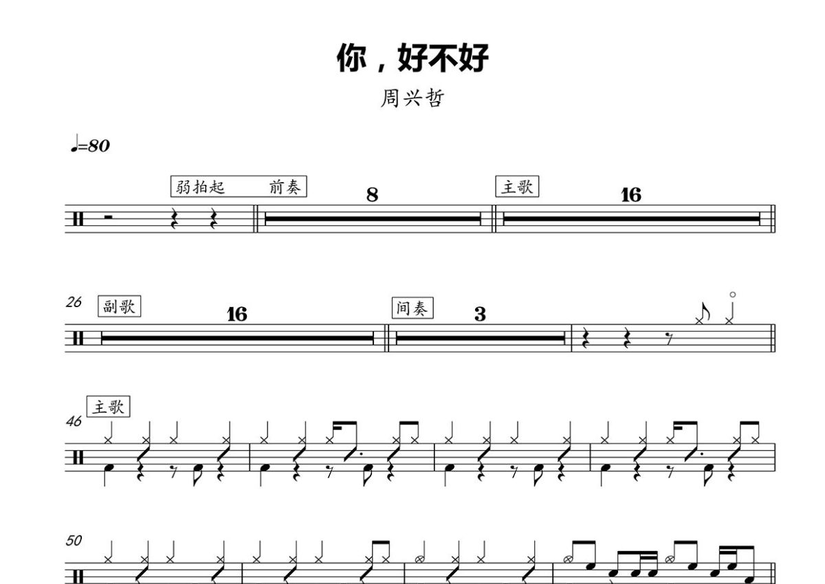 《你,好不好》是周兴哲演唱的一首歌曲,这份鼓谱共有两张高清图谱,图谱由 @打鼓谱 编配上传,图谱使用五线谱编配,使用这份你,好不好架子鼓谱,你将能够轻松地敲打出这首周兴哲的你,好不好,快来尝试吧。《你,好不好?》是周兴哲、吴易纬作词,周兴哲作曲并演唱的歌曲,于2016年5月20日发行,后收录在周兴哲2016年8月5日发行的专辑《爱,教会我们的事》中,是电视剧《遗憾拼图》的片尾曲。