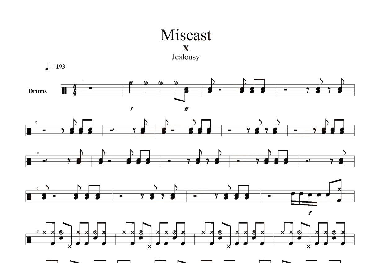 《Miscast》是X-JAPAN演唱的一首歌曲,这份鼓谱共有六张高清图谱,图谱由 @打鼓谱 编配上传,图谱使用五线谱编配,使用这份Miscast架子鼓谱,你将能够轻松地敲打出这首X-JAPAN的Miscast,快来尝试吧。《Miscast》是日本摇滚乐队X-JAPAN的第三张录音室专辑,于1991年6月1日发行。鉴于其创作版权的归属及最后Taiji的bass独奏,本专辑是乐队风格最复杂的专辑,重新灌录的《Jealousy》和《Blue Blood》于2007年2月14日再发,各收录了部分歌曲的伴奏。《Jealousy》初上oricon周专辑榜即登冠军,当年发行超过82.8万,是91年第12畅销的专辑。