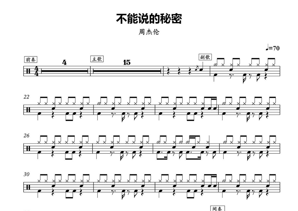 《不能说的秘密》是周杰伦演唱的一首歌曲,这份鼓谱共有两张高清图谱,图谱由 @打鼓谱 编配上传,图谱使用五线谱编配,使用这份不能说的秘密架子鼓谱,你将能够轻松地敲打出这首周杰伦的不能说的秘密,快来尝试吧。《不能说的秘密》是周杰伦演唱的一首歌曲,由方文山作词,周杰伦作曲,林迈可编曲,收录于2007年8月30日杰威尔音乐有限公司发行的电影《不能说的秘密》原声带专辑中。