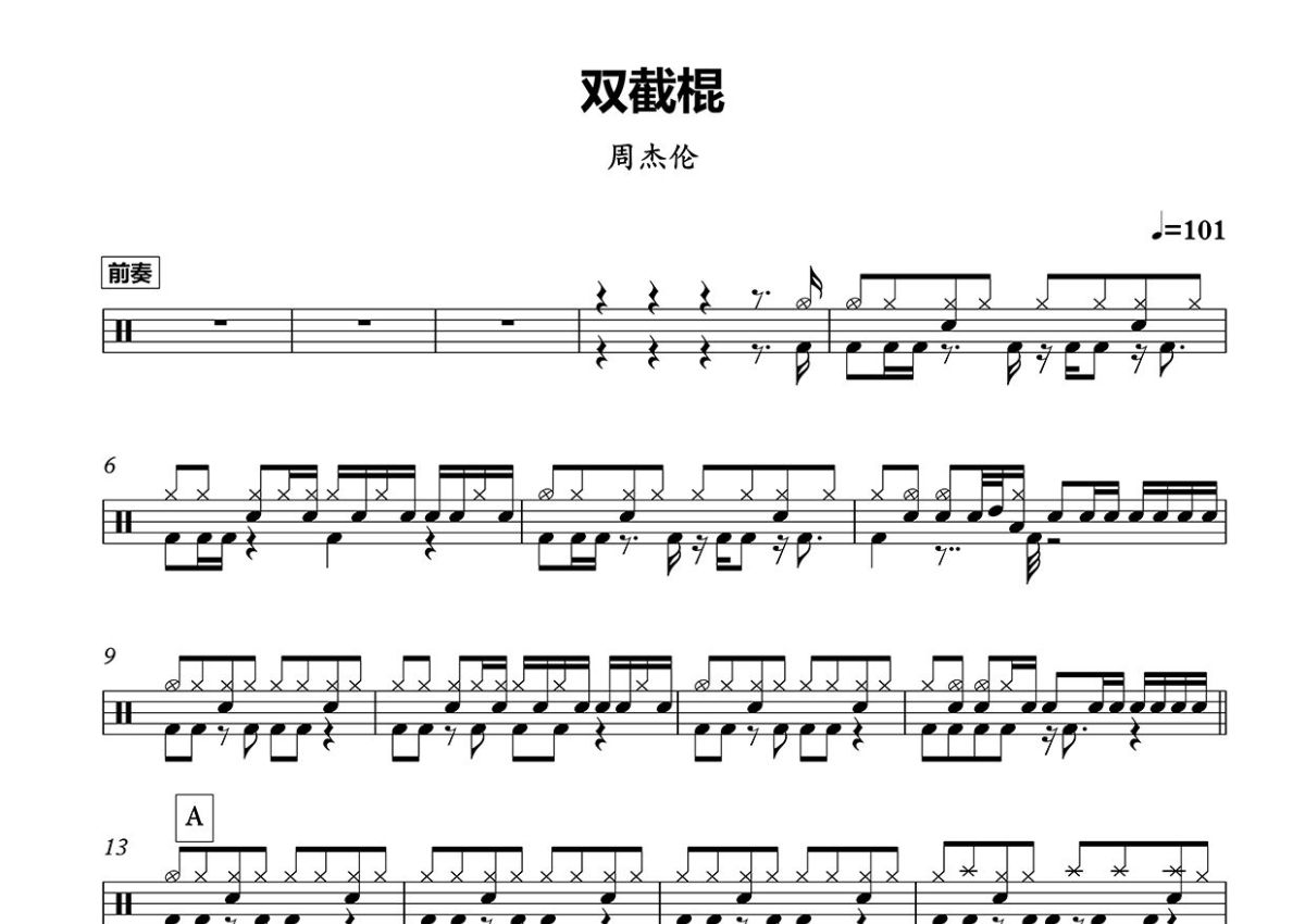 《双截棍》是周杰伦演唱的一首歌曲,这份鼓谱共有三张高清图谱,图谱由 @打鼓谱 编配上传,图谱使用五线谱编配,使用这份双截棍架子鼓谱,你将能够轻松地敲打出这首周杰伦的双截棍,快来尝试吧。《双截棍》是周杰伦演唱的一首歌曲,由周杰伦作曲,方文山作词,钟兴民编曲,收录于周杰伦2001年9月20日发行的专辑《范特西》中 。 2002年第13届台湾金曲奖中,钟兴民凭借《双截棍》成为“最佳编曲人奖”。2011年,电影《青蜂侠》使用该歌曲作为片尾曲。