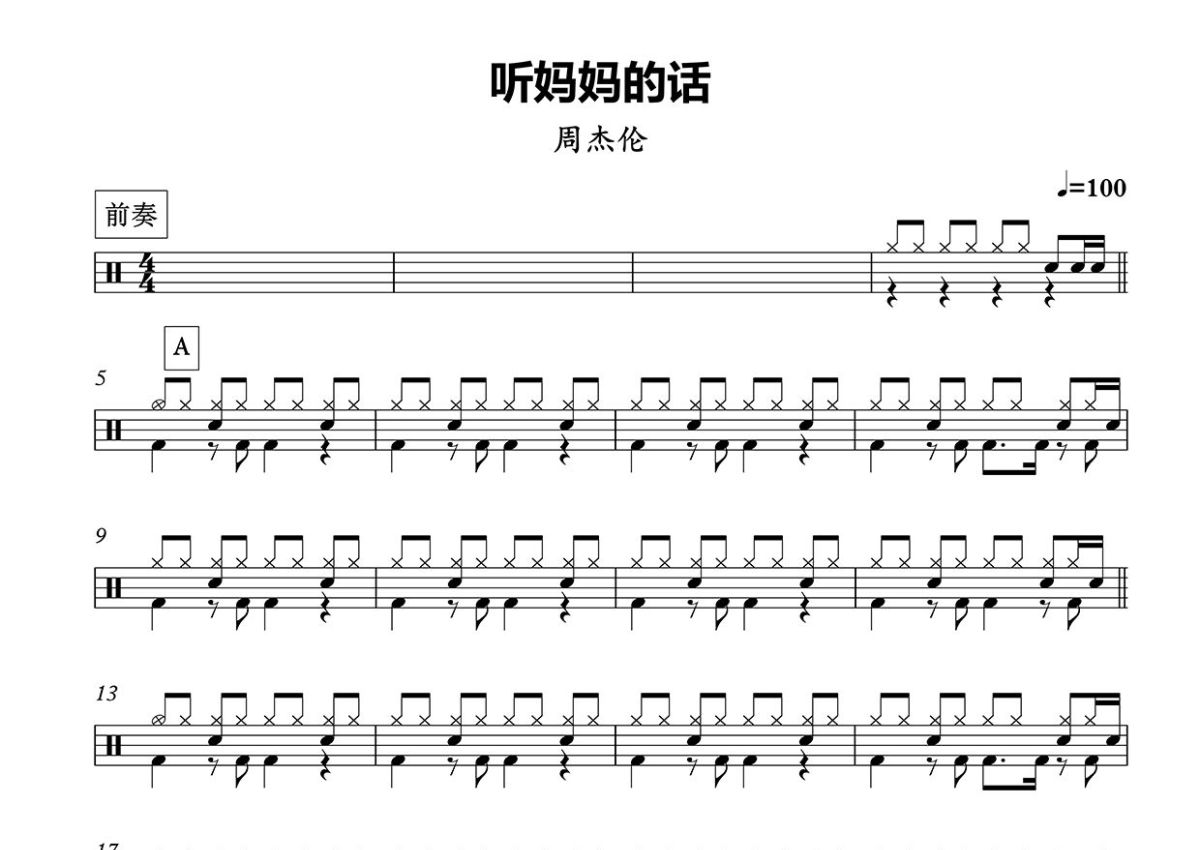 《听妈妈的话》是周杰伦演唱的一首歌曲,这份鼓谱共有三张高清图谱,图谱由 @打鼓谱 编配上传,图谱使用五线谱编配,使用这份听妈妈的话架子鼓谱,你将能够轻松地敲打出这首周杰伦的听妈妈的话,快来尝试吧。《听妈妈的话》是周杰伦演唱的一首歌曲,由周杰伦作词、作曲,林迈可、洪敬尧编曲,收录在周杰伦2006年9月5日发行的专辑《依然范特西》中 。 2006年,因其歌词传递了正能量,有潜移默化的教育意义,入选台北教育大学附属实验国民小学一年级教材。