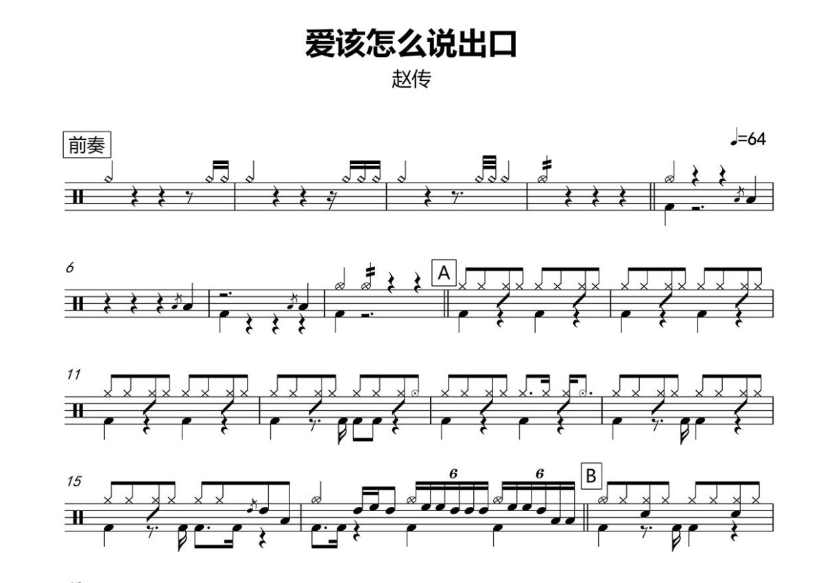 《爱该怎么说出口》是赵传演唱的一首歌曲,这份鼓谱共有两张高清图谱,图谱由 @打鼓谱 编配上传,图谱使用五线谱编配,使用这份爱该怎么说出口架子鼓谱,你将能够轻松地敲打出这首赵传的爱该怎么说出口,快来尝试吧。《爱要怎么说出口》是李宗盛填词、作曲,徐德昌、钟兴民编曲,赵传演唱的一首歌曲,收录于赵传1993年发行的专辑《约定》中。《我是歌手第四季》现场版由刘迦宁、周以力编曲。