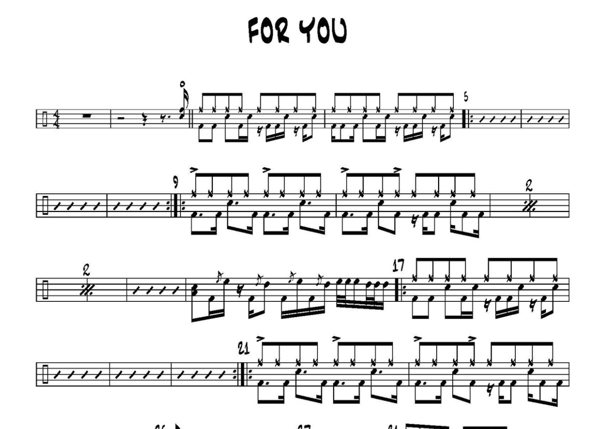 《For You》是对你演唱的一首歌曲,这份鼓谱共有两张高清图谱,图谱由 @打鼓谱 编配上传,图谱使用五线谱编配,使用这份For You架子鼓谱,你将能够轻松地敲打出这首对你的For You,快来尝试吧。《For_You(对你)》现场版。