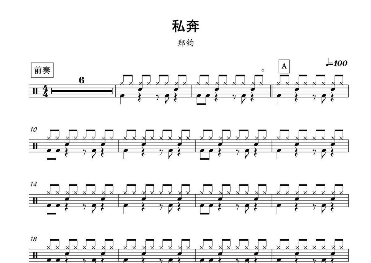 《私奔》是郑钧演唱的一首歌曲,这份鼓谱共有四张高清图谱,图谱由 @打鼓谱 编配上传,图谱使用五线谱编配,使用这份私奔架子鼓谱,你将能够轻松地敲打出这首郑钧的私奔,快来尝试吧。《私奔》是由郑钧作词、作曲并演唱的歌曲,歌曲时长5分18秒,收录于郑钧2006年6月19日发行的第六张专辑《长安长安》中。