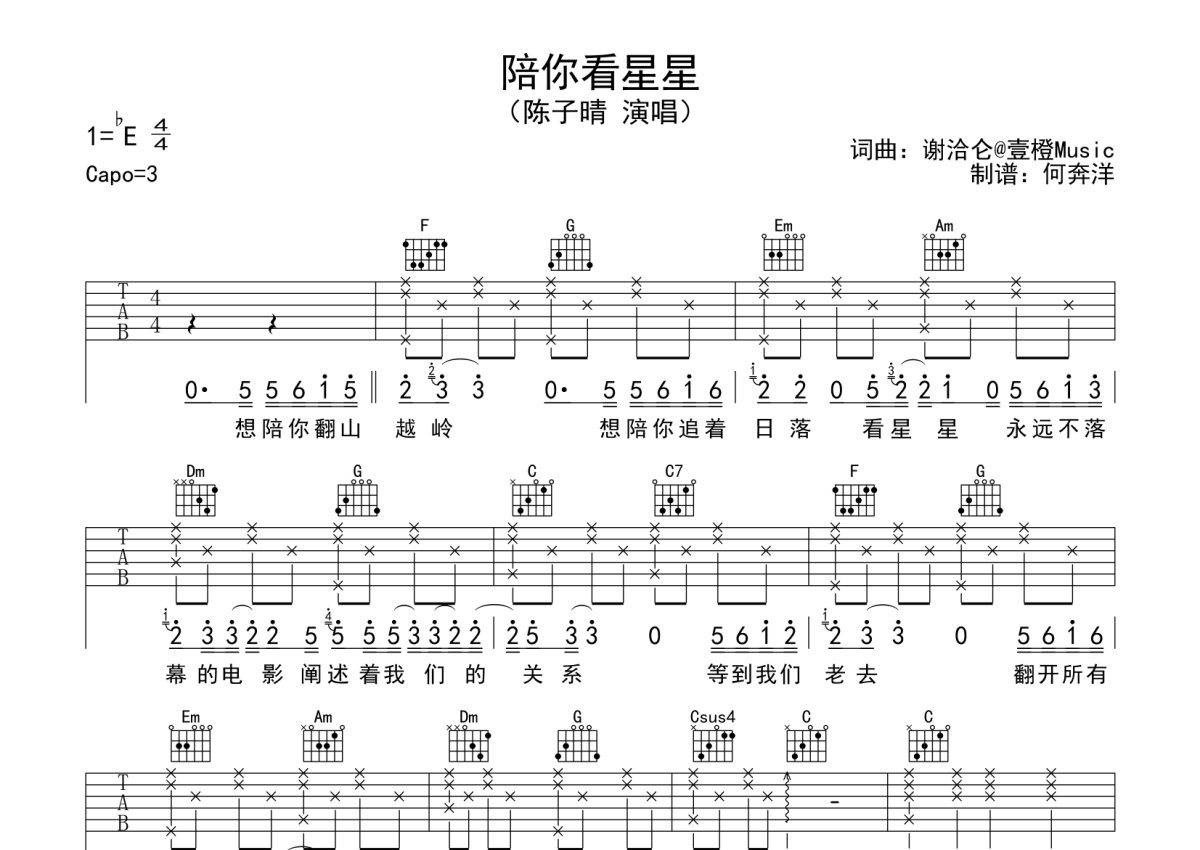 《陪你看星星》是陈子晴演唱的一首歌曲,本吉他谱采用的是C调指法编配,这份吉他谱共有两张高清图谱,图谱由 @何奔洋 编配上传,图谱使用六线谱编配,包含吉他和弦指法、简谱以及歌词部分,曲谱配备了相关的音频提供试听,使用这份陪你看星星吉他谱,可以让你更加方便地掌握这首歌曲的弹唱技巧,快来尝试吧。陈子晴《陪你看星星》吉他谱_C调吉他弹唱谱。