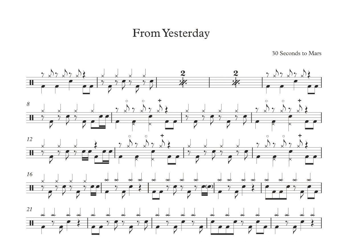 《From Yesterday》是30 Seconds To Mars演唱的一首歌曲,这份鼓谱共有两张高清图谱,图谱由 @打鼓谱 编配上传,图谱使用五线谱编配,使用这份From Yesterday架子鼓谱,你将能够轻松地敲打出这首30 Seconds To Mars的From Yesterday,快来尝试吧。30秒上火星(30 Seconds To Mars)是一组来自美国加利福尼亚州洛杉矶的摇滚乐队,组建于1998年,由乐队主唱、吉他、贝斯、键盘手杰瑞德·莱托以及他的哥哥,鼓手夏农·莱托组成。