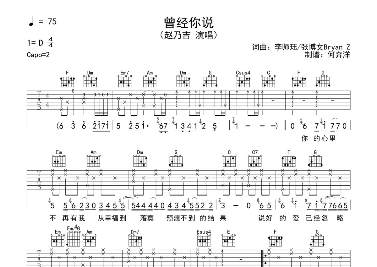 《曾经你说》是赵乃吉演唱的一首歌曲,本吉他谱采用的是C调指法编配,这份吉他谱共有两张高清图谱,图谱由 @何奔洋 编配上传,图谱使用六线谱编配,包含吉他和弦指法、简谱以及歌词部分,使用这份曾经你说吉他谱,可以让你更加方便地掌握这首歌曲的弹唱技巧,快来尝试吧。赵乃吉《曾经你说》吉他谱_C调吉他弹唱谱。