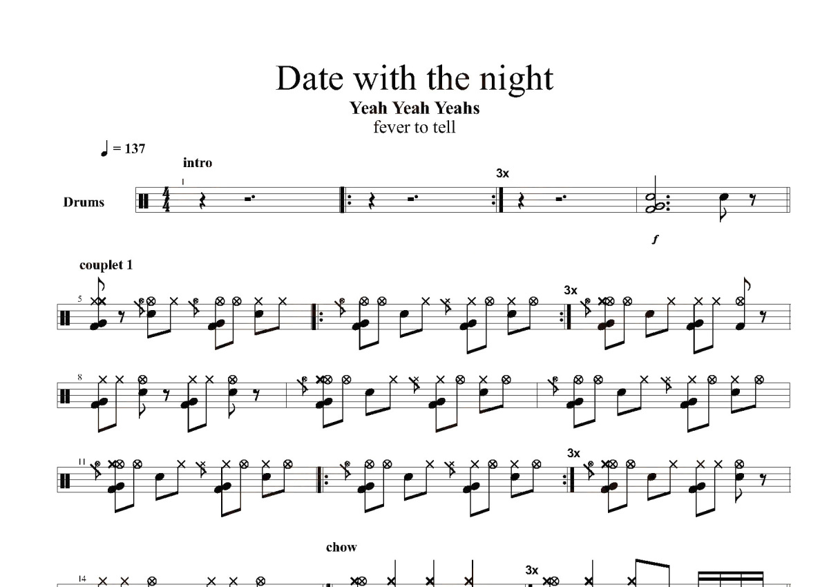 《Date With The Night》是Yeah Yeah Yeahs演唱的一首歌曲,这份鼓谱共有三张高清图谱,图谱由 @打鼓谱 编配上传,图谱使用五线谱编配,使用这份Date With The Night架子鼓谱,你将能够轻松地敲打出这首Yeah Yeah Yeahs的Date With The Night,快来尝试吧。Yeah Yeah Yeahs是来自纽约的一个三人乐队,其成员分别是Karen O(主唱),Brian Chase(鼓手),Nick Zinner(吉他手)。成立18个月后,他们在全美就成为广受评论的一个乐队了。有了White Stripes和The Strokes的全力支持,乐队在早期纽约的演出场场爆满,春季的欧洲演出也有很高的上座率。在Jon Spencer Blues Explosion欧洲巡演中,Yeah Yeah Yeahs有幸做了开场表演,在随后的一个星期中,他们又开展了一系列表演,赢得了广泛。