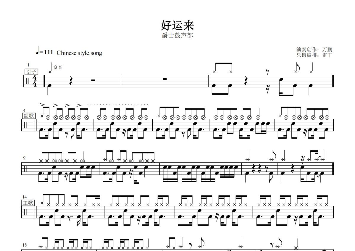 《好运来》是宋祖英演唱的一首歌曲,这份鼓谱共有三张高清图谱,图谱由 @打鼓谱 编配上传,图谱使用五线谱编配,使用这份好运来架子鼓谱,你将能够轻松地敲打出这首宋祖英的好运来,快来尝试吧。《好运来》改编版架子鼓。