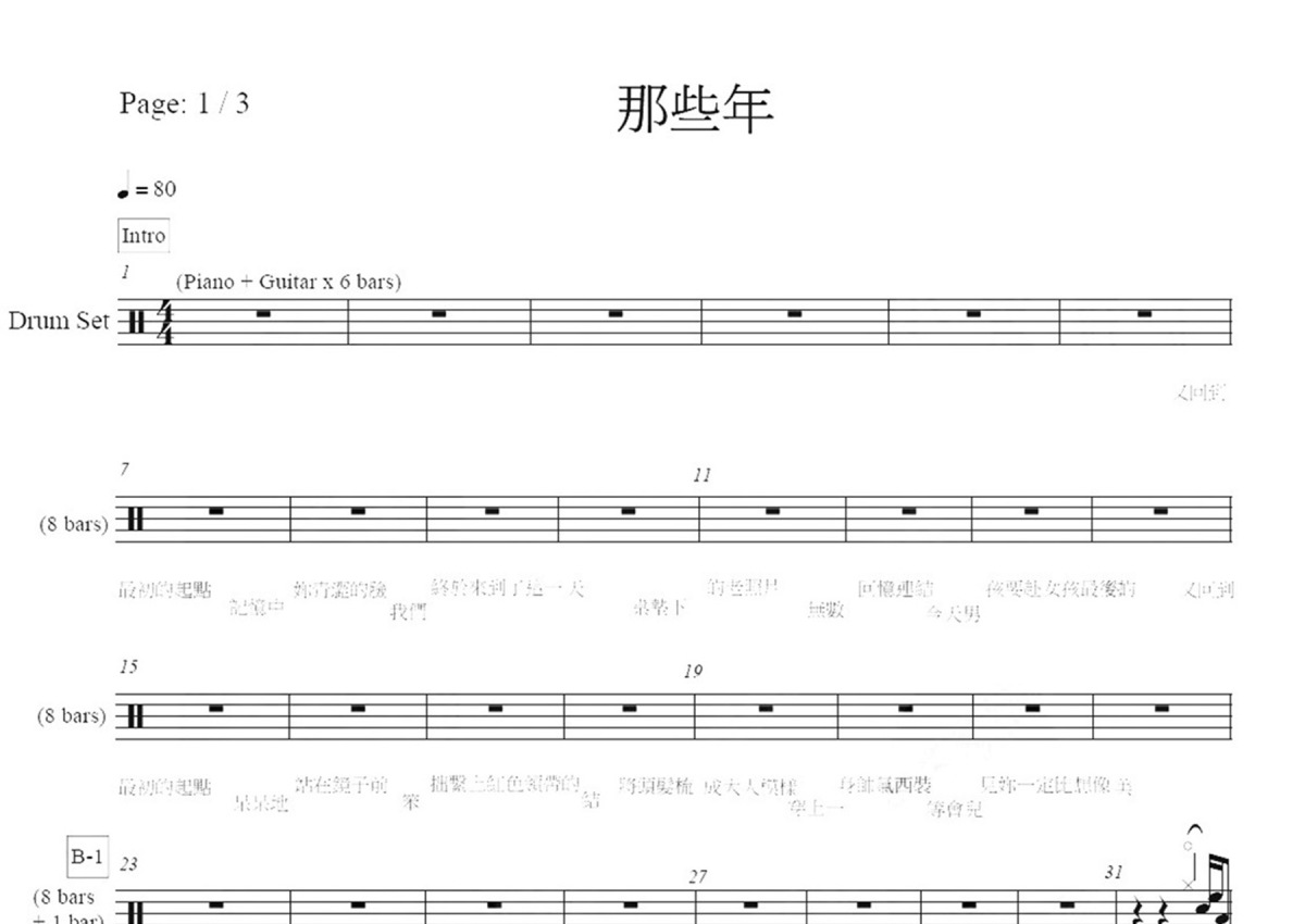 《那些年》是胡夏演唱的一首歌曲,这份鼓谱共有三张高清图谱,图谱由 @打鼓谱 编配上传,图谱使用五线谱编配,使用这份那些年架子鼓谱,你将能够轻松地敲打出这首胡夏的那些年,快来尝试吧。《那些年》是电影《那些年,我们一起追的女孩。》的主题曲,由九把刀作词,木村充利作曲,胡夏演唱。收录在专辑《那些年,我们一起追的女孩 电影原声带》和胡夏2012年发行的专辑《燃点》中。胡夏,1990年3月1日出生于广西壮族自治区南宁市西乡塘区,中国内地男歌手、演员。