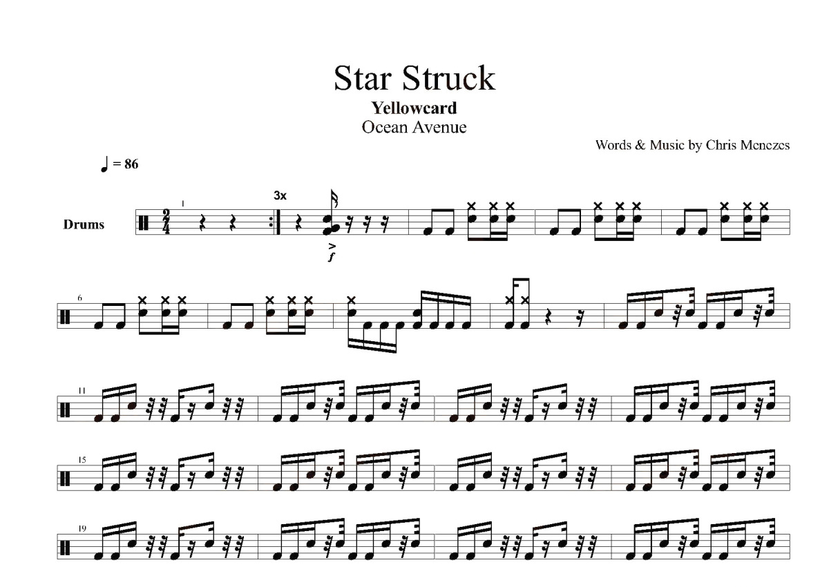 《Star Struck》是Yellowcard演唱的一首歌曲,这份鼓谱共有三张高清图谱,图谱由 @打鼓谱 编配上传,图谱使用五线谱编配,使用这份Star Struck架子鼓谱,你将能够轻松地敲打出这首Yellowcard的Star Struck,快来尝试吧。YELLOWCARD LIGHTS AND SOUNDS 全美Billboard排行榜前五名专辑