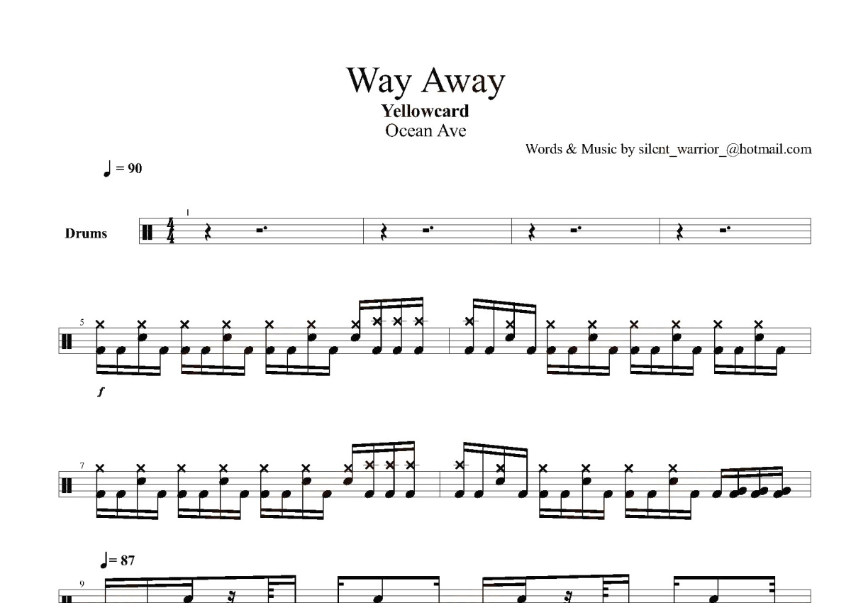 《Way Away》是Yellowcard演唱的一首歌曲,这份鼓谱共有四张高清图谱,图谱由 @打鼓谱 编配上传,图谱使用五线谱编配,使用这份Way Away架子鼓谱,你将能够轻松地敲打出这首Yellowcard的Way Away,快来尝试吧。专辑名称:The Underdog (EP) 艺术家:Yellowcard风格:Punk / Rock 发行日期:2002 专辑曲目:1.Underdog 2.Avondale 3.Finish Line 4.Powder 5.Rocket Way Away 歌手:Yellowcard发行时间:2004-05-31 流派:摇滚 发行公司:EMI1。
