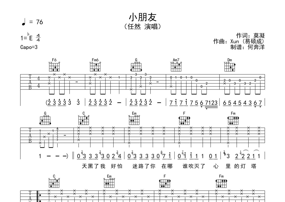 《小朋友》是任然演唱的一首歌曲,本吉他谱采用的是C调指法编配,这份吉他谱共有两张高清图谱,图谱由 @何奔洋 编配上传,图谱使用六线谱编配,包含吉他和弦指法、简谱以及歌词部分,使用这份小朋友吉他谱,可以让你更加方便地掌握这首歌曲的弹唱技巧,快来尝试吧。任然《小朋友》吉他谱_C调吉他弹唱谱。