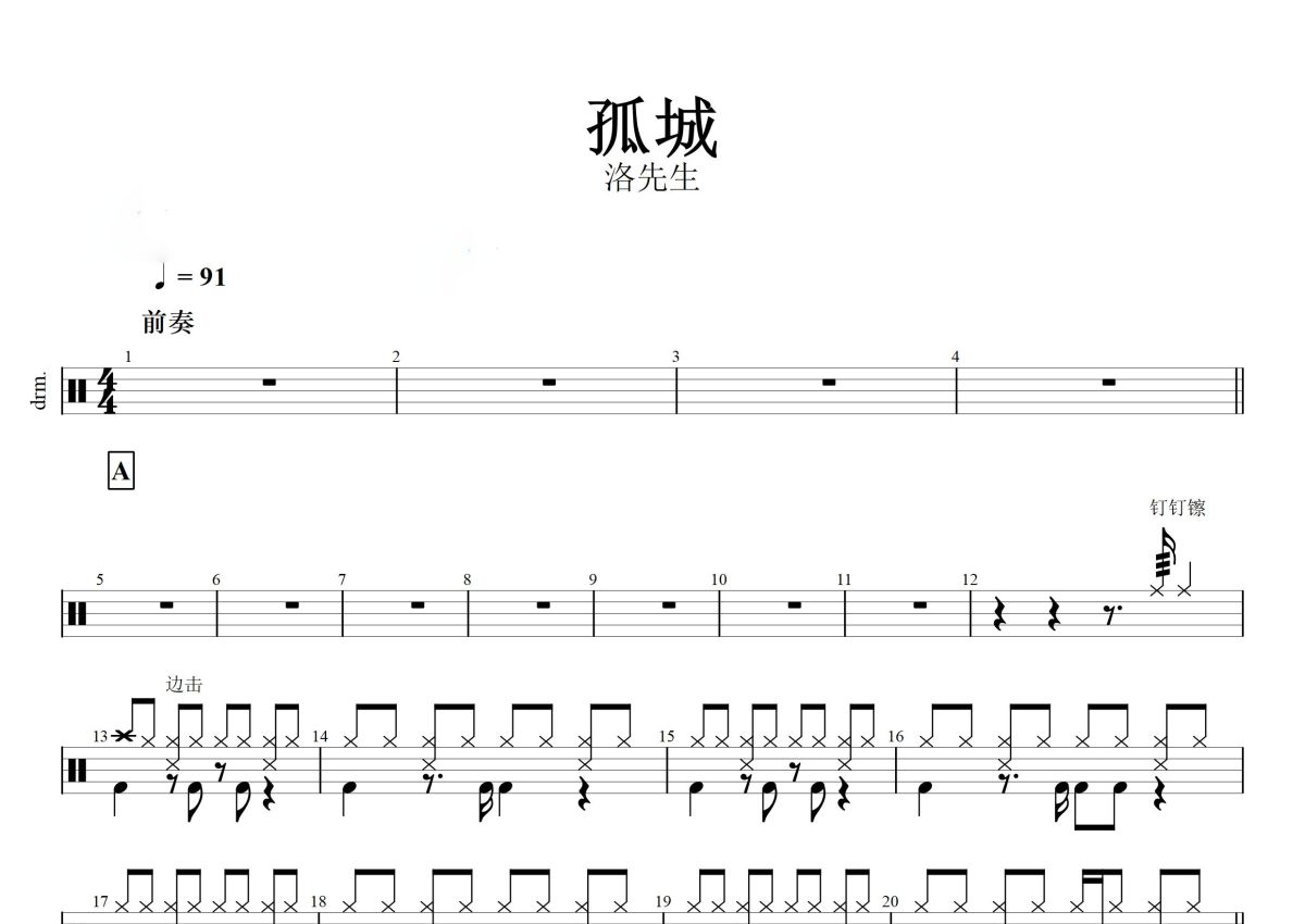 洛先生《孤城》鼓谱 - 架子鼓谱