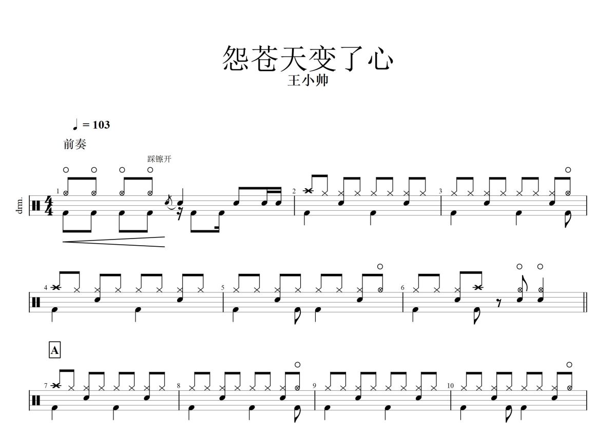 《怨苍天变了心》是王小帅演唱的一首歌曲,这份鼓谱共有三张高清图谱,图谱由 @打鼓谱 编配上传,图谱使用五线谱编配,使用这份怨苍天变了心架子鼓谱,你将能够轻松地敲打出这首王小帅的怨苍天变了心,快来尝试吧。cover方季惟。