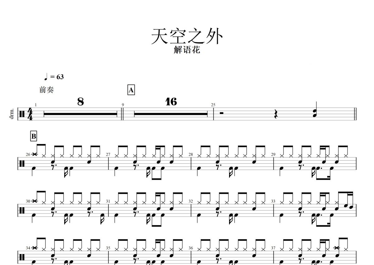 《天空之外》是解语花演唱的一首歌曲,这份鼓谱共有两张高清图谱,图谱由 @打鼓谱 编配上传,图谱使用五线谱编配,使用这份天空之外架子鼓谱,你将能够轻松地敲打出这首解语花的天空之外,快来尝试吧。天空之外 解语花 cover 弦子。