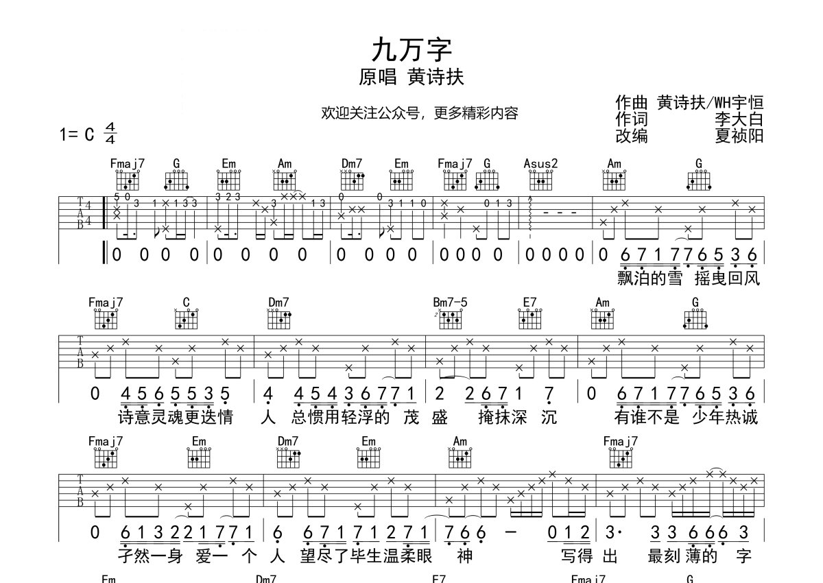 黄诗扶《九万字》吉他谱 - C调弹唱六线谱