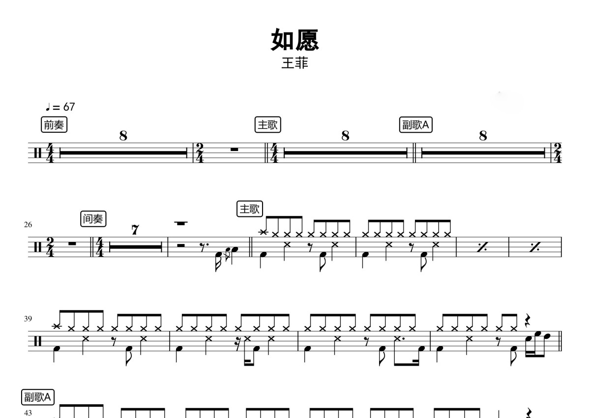 王菲《如愿》鼓谱 - 架子鼓谱