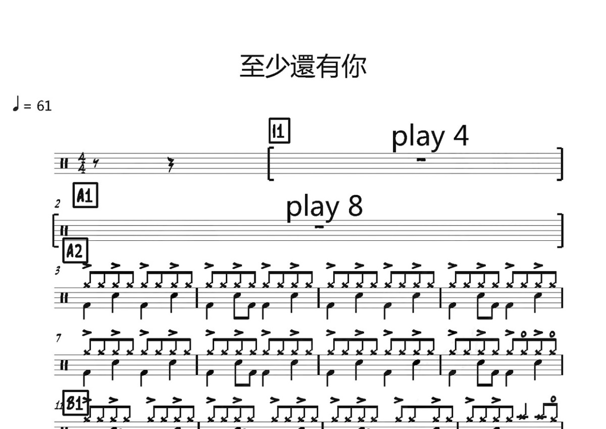 《至少还有你》是林忆莲演唱的一首歌曲,这份鼓谱共有两张高清图谱,图谱由 @打鼓谱 编配上传,图谱使用五线谱编配,使用这份至少还有你架子鼓谱,你将能够轻松地敲打出这首林忆莲的至少还有你,快来尝试吧。《至少还有你》是林忆莲演唱的一首歌曲,由林夕作词,Davy Chan(陈匡荣)作曲,Jim Ling、刘志远共同编曲,李振权担任制作人,收录于林忆莲2000年1月18日发行的专辑《林忆莲's》中。 该歌曲是电影《安娜与国王》的中文主题曲。2001年,该曲获得首届华语流行乐传媒大奖。 [7] 2010年,该曲获得港台十年十大金曲。 林忆莲(Sandy Lam),1966年4月26日出生于中国香港,祖籍浙江宁波,华语流行乐女歌手、影视演员、音乐制作人。