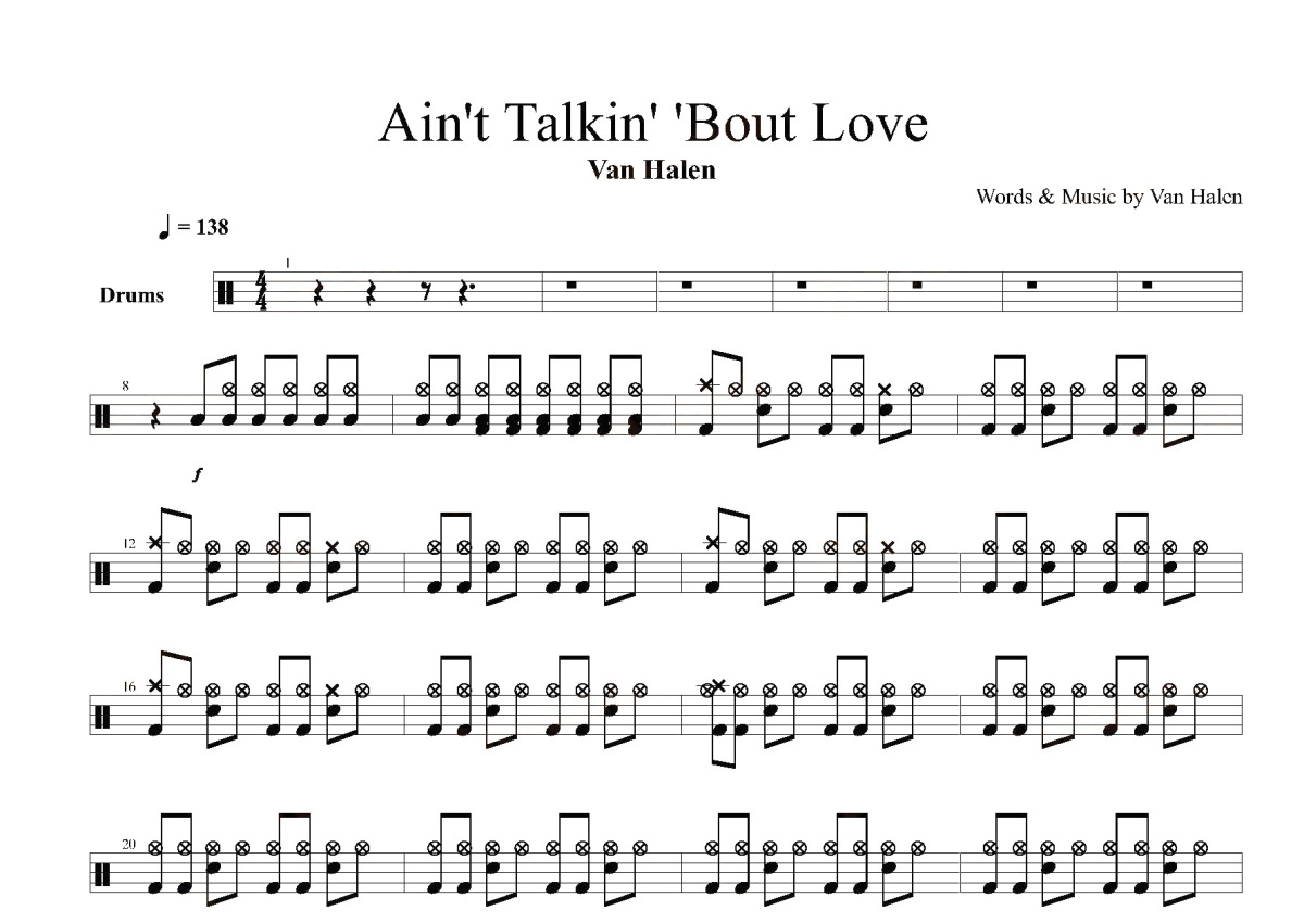 《Ain't Talkin' Bout Love》是Van Halen演唱的一首歌曲,这份鼓谱共有四张高清图谱,图谱由 @打鼓谱 编配上传,图谱使用五线谱编配,使用这份Ain't Talkin' Bout Love架子鼓谱,你将能够轻松地敲打出这首Van Halen的Ain't Talkin' Bout Love,快来尝试吧。Ain'T Talkin' Bout Love
