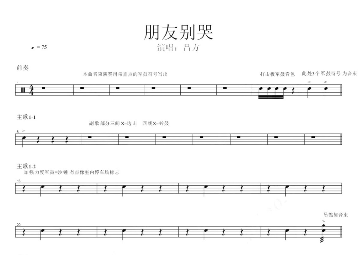 吕方《朋友别哭》鼓谱 - 架子鼓谱