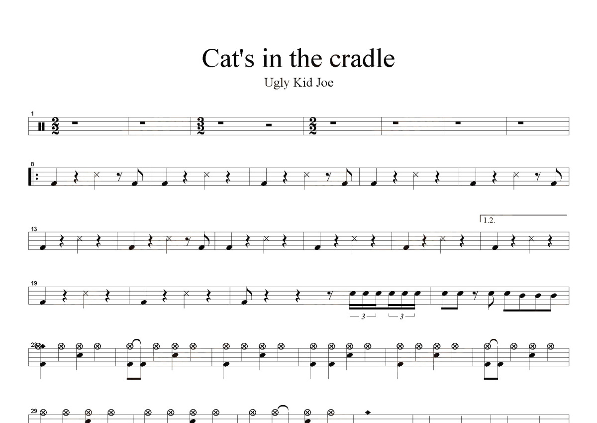 《Cat's in the Cradle》是Ugly Kid Joe演唱的一首歌曲,这份鼓谱共有两张高清图谱,图谱由 @打鼓谱 编配上传,图谱使用五线谱编配,使用这份Cat's in the Cradle架子鼓谱,你将能够轻松地敲打出这首Ugly Kid Joe的Cat's in the Cradle,快来尝试吧。《Cat's in the Cradle》是美国民谣歌手Harry Chapin第四张录音室专辑《Verities & Balderdash》中的首支单曲,也是Harry Chapin在Billboard Hot 100上唯一的冠军单曲。 [1]。