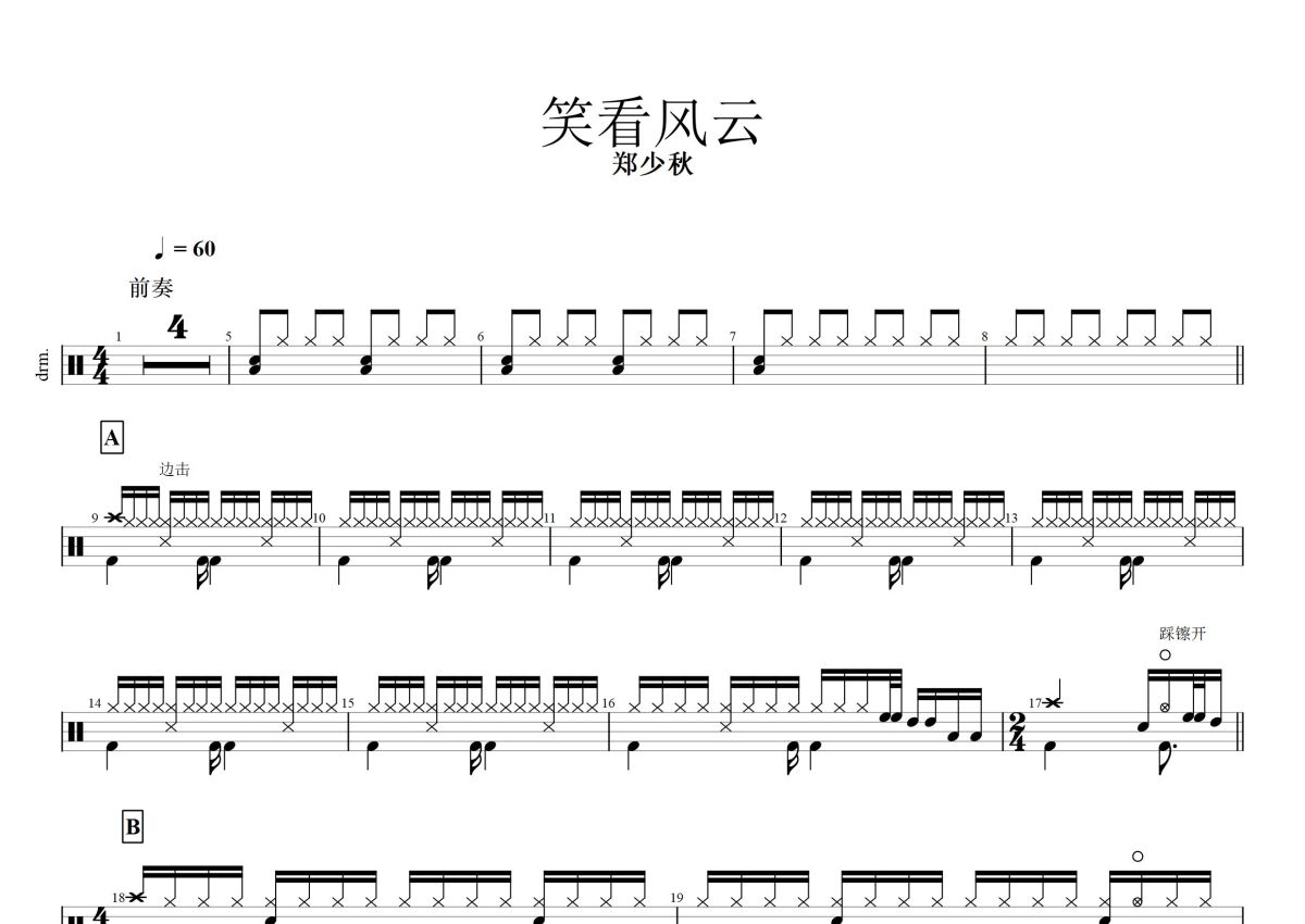 《笑看风云》是郑少秋演唱的一首歌曲,这份鼓谱共有两张高清图谱,图谱由 @打鼓谱 编配上传,图谱使用五线谱编配,使用这份笑看风云架子鼓谱,你将能够轻松地敲打出这首郑少秋的笑看风云,快来尝试吧。