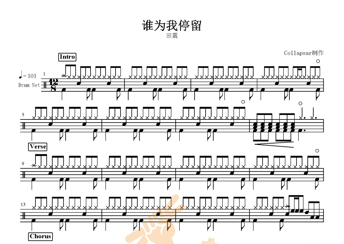 《谁为我停留》是田震演唱的一首歌曲,这份鼓谱共有三张高清图谱,图谱由 @打鼓谱 编配上传,图谱使用五线谱编配,使用这份谁为我停留架子鼓谱,你将能够轻松地敲打出这首田震的谁为我停留,快来尝试吧。《谁为我停留》是田震演唱的一首歌曲,由陈涛、张新宇作词、作曲,收录于专辑《田震(田震作品精选集)》。