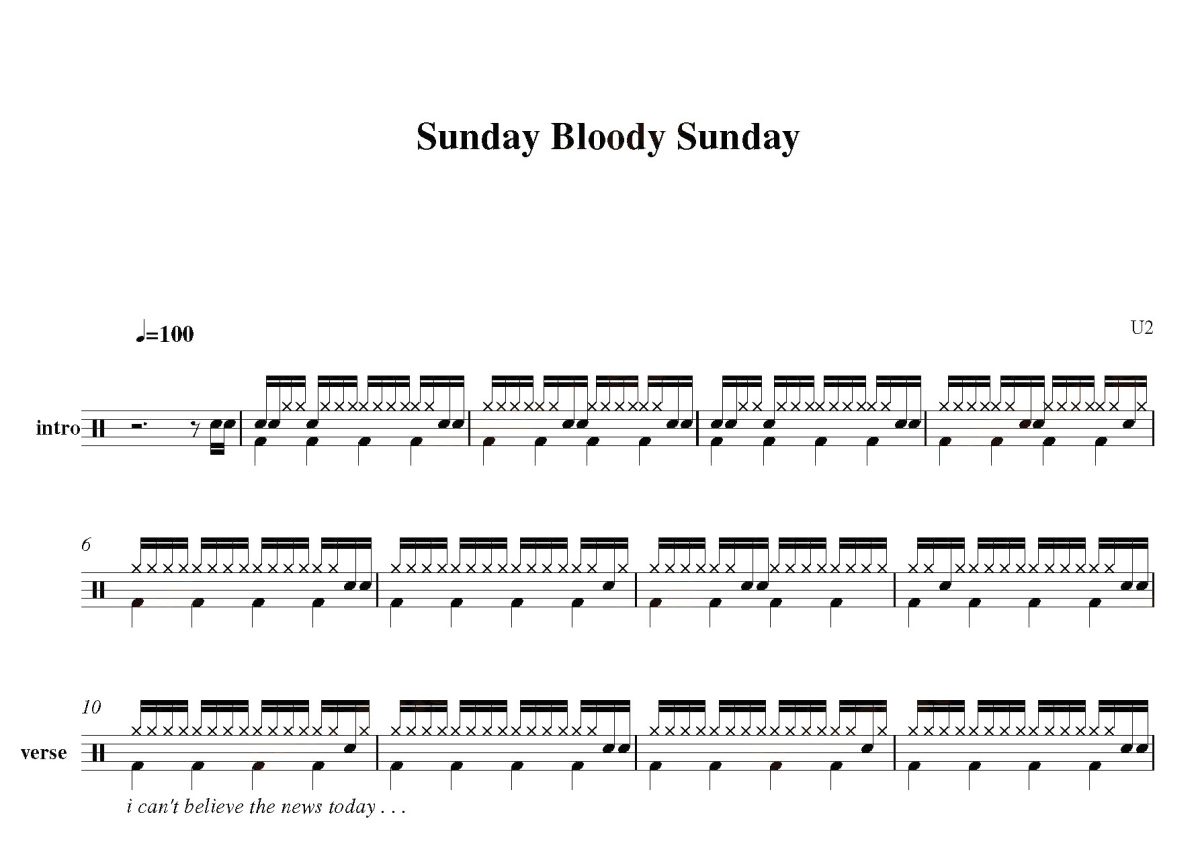 《Sunday bloody sunday》是U2演唱的一首歌曲,这份鼓谱共有三张高清图谱,图谱由 @打鼓谱 编配上传,图谱使用五线谱编配,使用这份Sunday bloody sunday架子鼓谱,你将能够轻松地敲打出这首U2的Sunday bloody sunday,快来尝试吧。来自U2的第三张专辑War,这是一张难以忘怀的专辑,这里不再是少年的青春期世界,而是由少年迈向青年的一个转变,在Sunday bloodysunday,New Years day ,Second里都可感受到U2对战争所带来的血腥和杀戮的反对和愤怒,他们第一次用歌声唱出了一个他们眼里的世界。