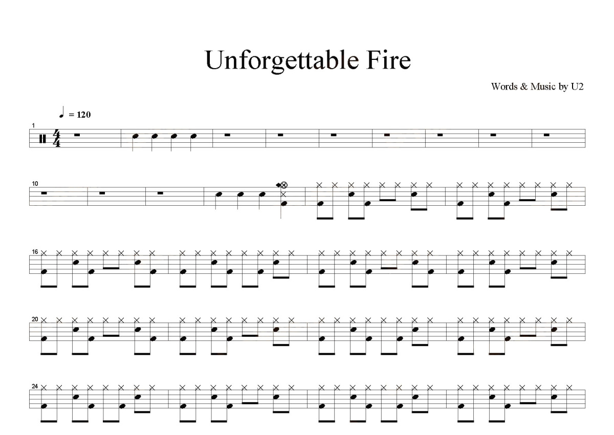 《The unforgettable fire》是U2演唱的一首歌曲,这份鼓谱共有四张高清图谱,图谱由 @打鼓谱 编配上传,图谱使用五线谱编配,使用这份The unforgettable fire架子鼓谱,你将能够轻松地敲打出这首U2的The unforgettable fire,快来尝试吧。歌曲The unforgettable fire语言英语发行日期2009-10-19歌手Jeanie B! and The Jelly Beans所属专辑Tribute To U2 Vol. 1。