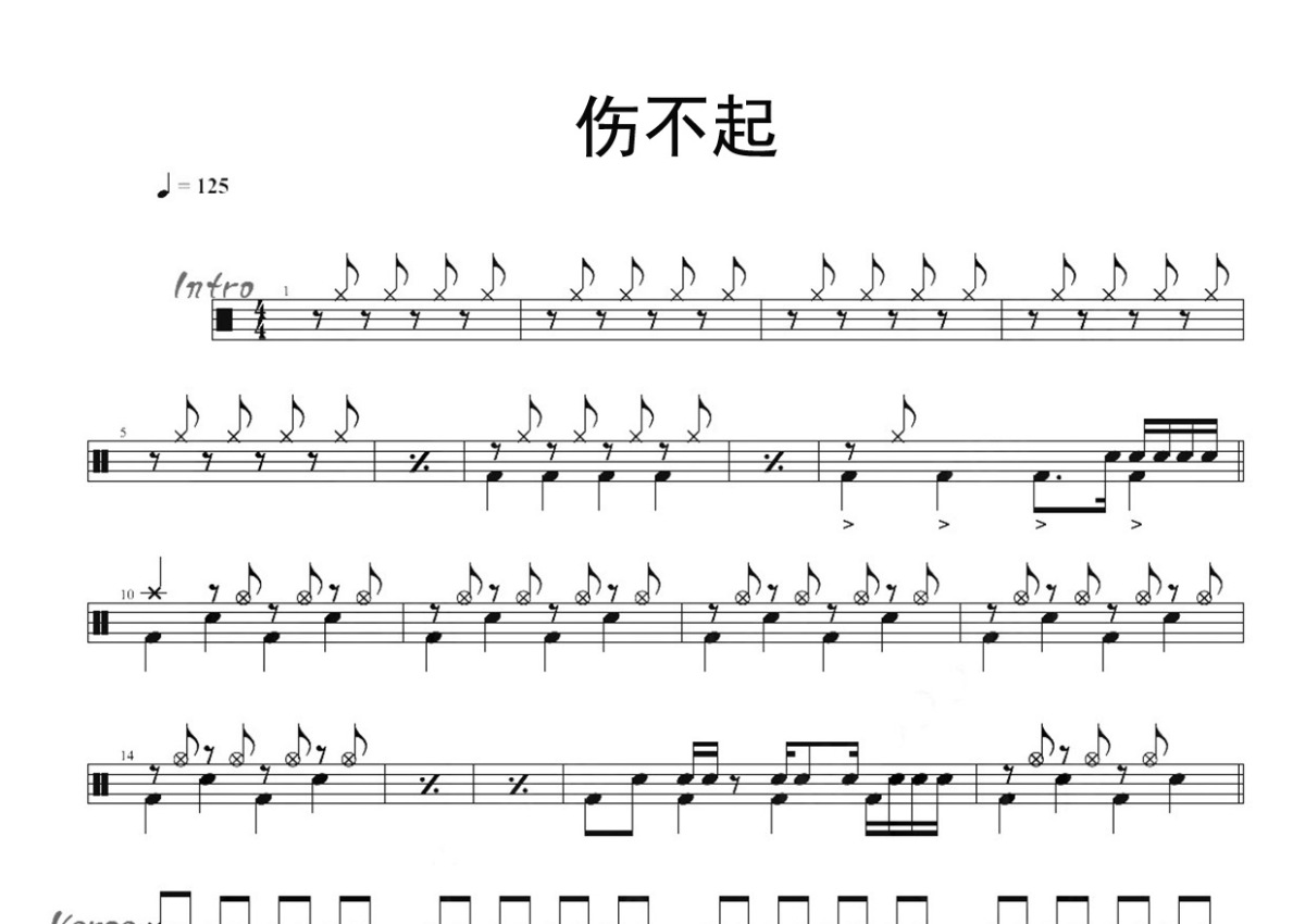 《伤不起》是王麟演唱的一首歌曲,这份鼓谱共有三张高清图谱,图谱由 @打鼓谱 编配上传,图谱使用五线谱编配,使用这份伤不起架子鼓谱,你将能够轻松地敲打出这首王麟的伤不起,快来尝试吧。《伤不起》是由老猫作曲,化石作词,王麟演唱的歌曲。收录于2012年4月1日王麟发行的专辑《因为爱情Ⅱ》中。2012年,该曲获得中国音乐金榜十年原创金曲奖。王麟,1983年9月26日出生于广东省广州市,中国内地女歌手。