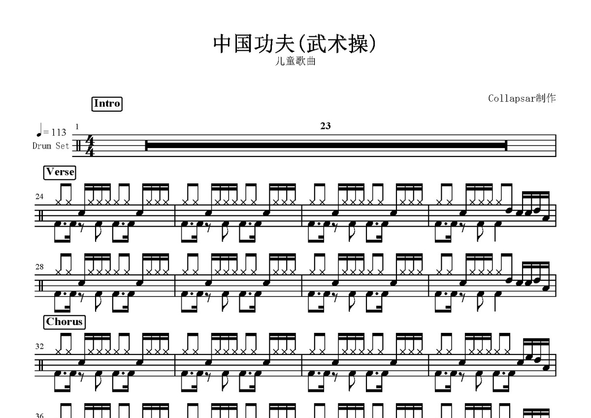 《中国功夫》是儿童歌曲演唱的一首歌曲,这份鼓谱共有两张高清图谱,图谱由 @打鼓谱 编配上传,图谱使用五线谱编配,使用这份中国功夫架子鼓谱,你将能够轻松地敲打出这首儿童歌曲的中国功夫,快来尝试吧。儿童歌曲 - 中国功夫(武术操)。