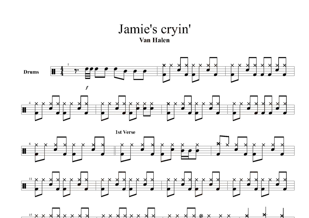 《Jamie's Cryin》是Van Halen演唱的一首歌曲,这份鼓谱共有四张高清图谱,图谱由 @打鼓谱 编配上传,图谱使用五线谱编配,使用这份Jamie's Cryin架子鼓谱,你将能够轻松地敲打出这首Van Halen的Jamie's Cryin,快来尝试吧。是由Van Halen于1978年发行的专辑。专辑曲目 1. Runnin' With The Devil 2. Eruption 3. You Really Got Me 4. Ain't Talkin' 'Bout Love 5. I'm The One 6. Jamie's Cryin'7. Atomic Punk 8. Feel。
