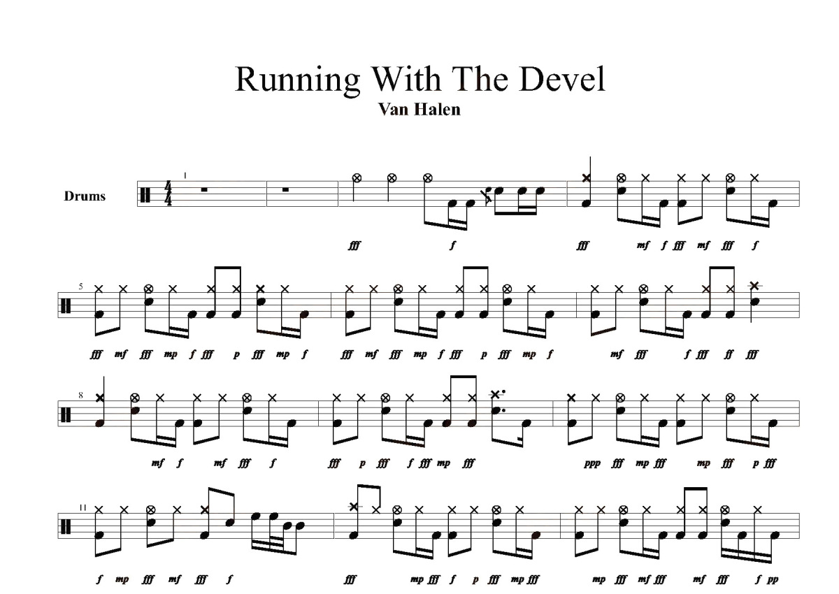 《Runnin With The Devil》是Van Halen演唱的一首歌曲,这份鼓谱共有四张高清图谱,图谱由 @打鼓谱 编配上传,图谱使用五线谱编配,使用这份Runnin With The Devil架子鼓谱,你将能够轻松地敲打出这首Van Halen的Runnin With The Devil,快来尝试吧。《Van Halen》是由Van Halen于1978年发行的专辑。专辑曲目 1. Runnin' With The Devil 2. Eruption 3. You Really Got Me 4. Ain't Talkin' 'Bout Love 5. I'm The One 6. Jamie's Cryin'7. Atomic Punk 8. Feel 。