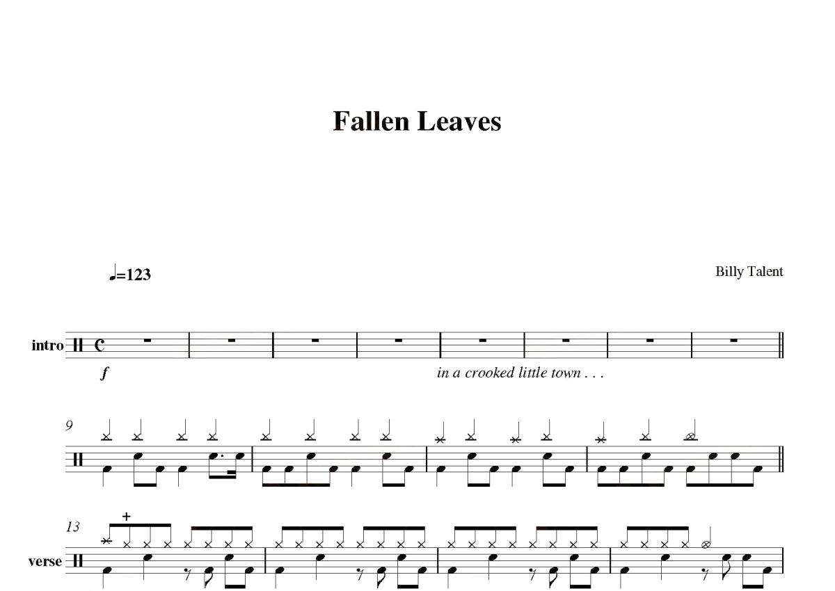 《Fallen leaves》是Billy Talent演唱的一首歌曲,这份鼓谱共有两张高清图谱,图谱由 @打鼓谱 编配上传,图谱使用五线谱编配,使用这份Fallen leaves架子鼓谱,你将能够轻松地敲打出这首Billy Talent的Fallen leaves,快来尝试吧。Fallen Leaves