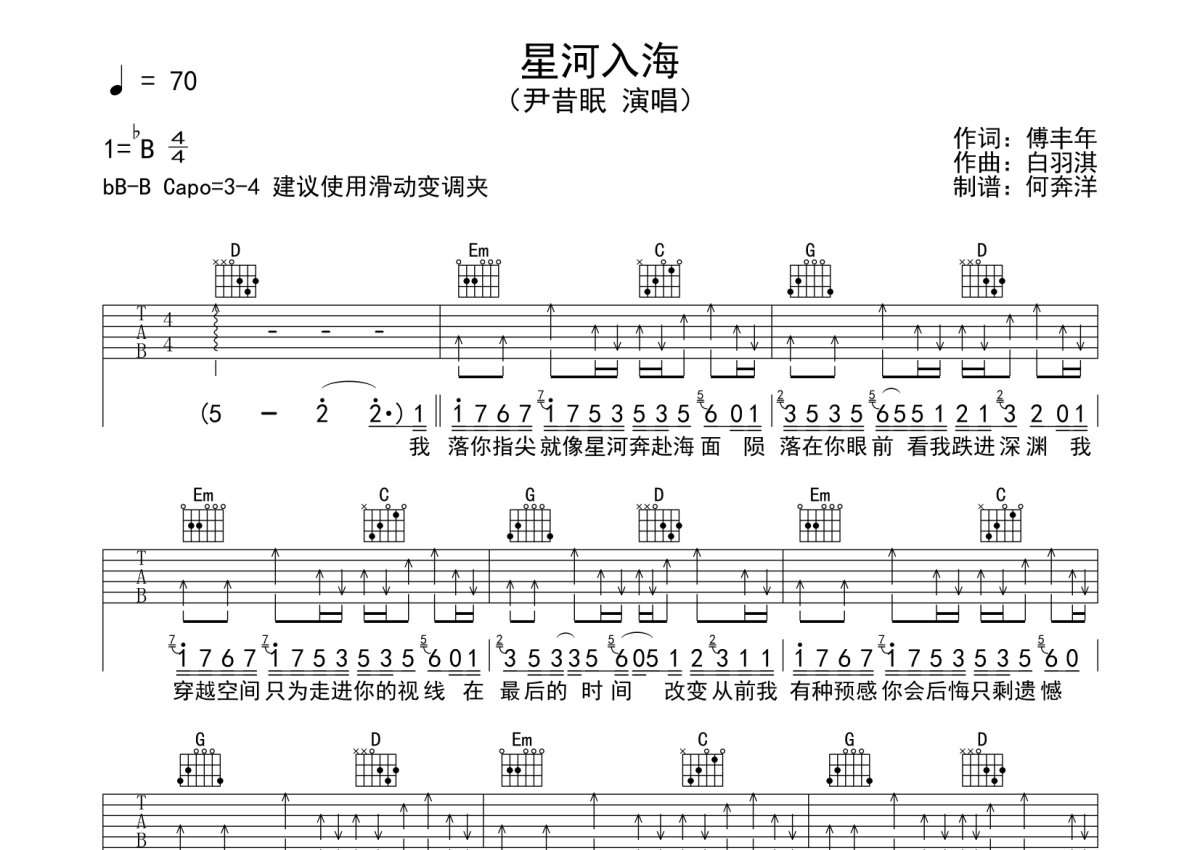 《星河入海》是尹昔眠演唱的一首歌曲,本吉他谱采用的是G调指法编配,这份吉他谱共有两张高清图谱,图谱由 @何奔洋 编配上传,图谱使用六线谱编配,包含吉他和弦指法、简谱以及歌词部分,使用这份星河入海吉他谱,可以让你更加方便地掌握这首歌曲的弹唱技巧,快来尝试吧。未编配转调部分,建议使用滑动变调夹。