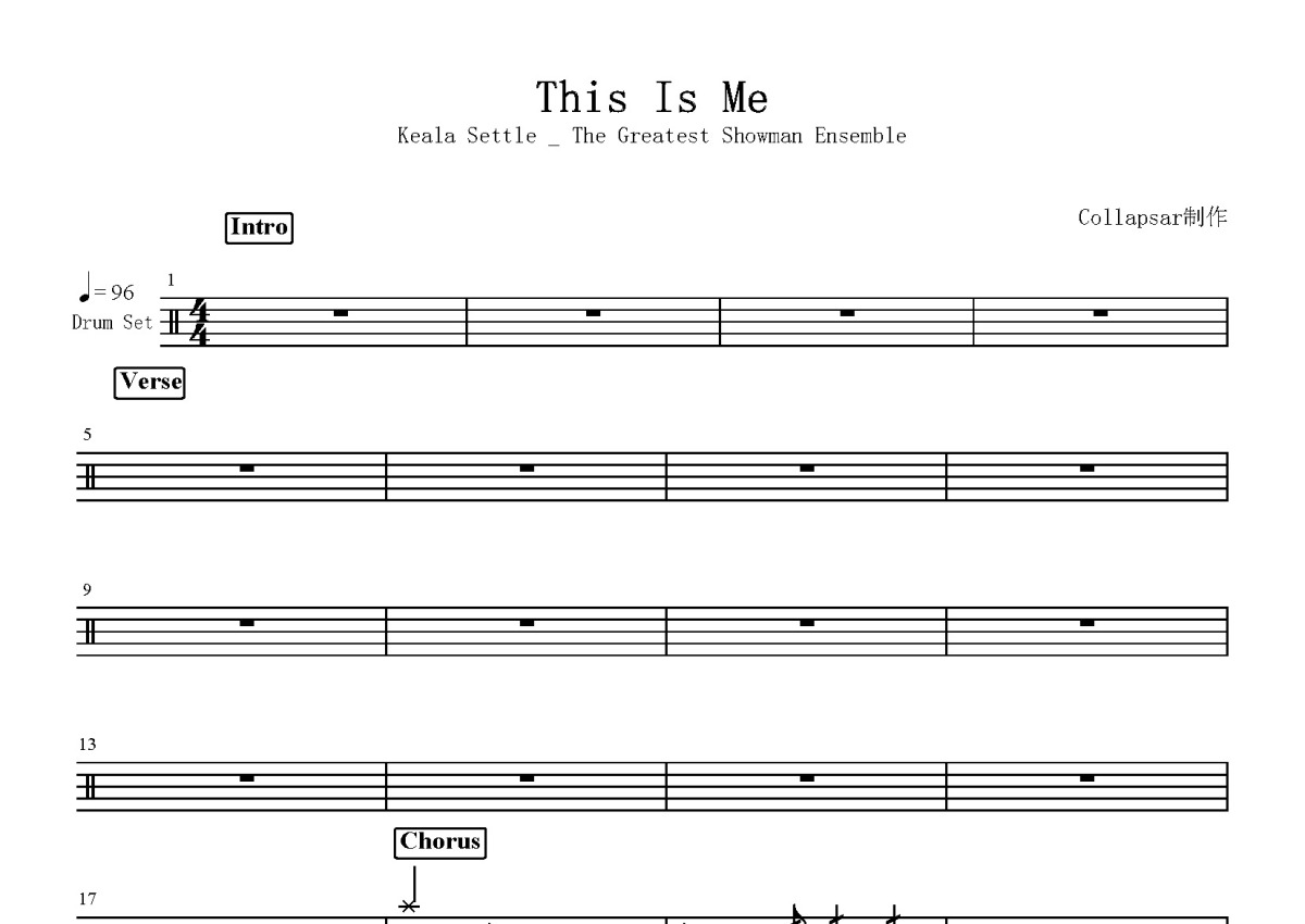 《This Is Me》是Keala Settle演唱的一首歌曲,这份鼓谱共有三张高清图谱,图谱由 @打鼓谱 编配上传,图谱使用五线谱编配,使用这份This Is Me架子鼓谱,你将能够轻松地敲打出这首Keala Settle的This Is Me,快来尝试吧。《This Is Me》是基拉·赛特尔为电影《马戏之王》演唱的主题曲,词曲由本杰·帕塞克和贾斯汀·保罗创作,收录于2017年12月8日发行的电影同名原声专辑中。