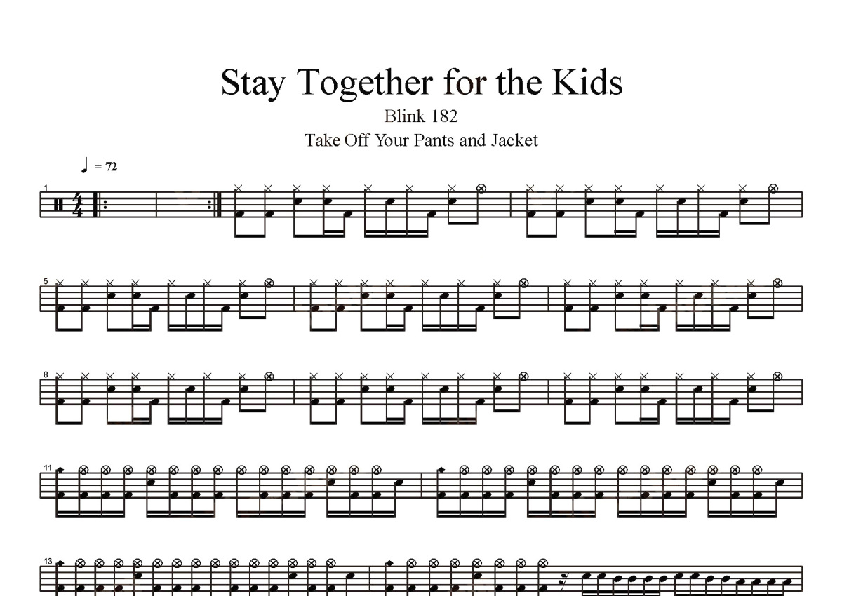 《Stay Together for the Kids》是Blink 182演唱的一首歌曲,这份鼓谱共有三张高清图谱,图谱由 @打鼓谱 编配上传,图谱使用五线谱编配,使用这份Stay Together for the Kids架子鼓谱,你将能够轻松地敲打出这首Blink 182的Stay Together for the Kids,快来尝试吧。歌曲名:Stay Together For The Kids