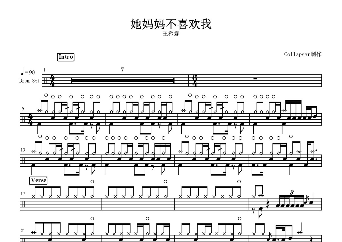 王矜霖《他妈妈不喜欢我》鼓谱 - 架子鼓谱