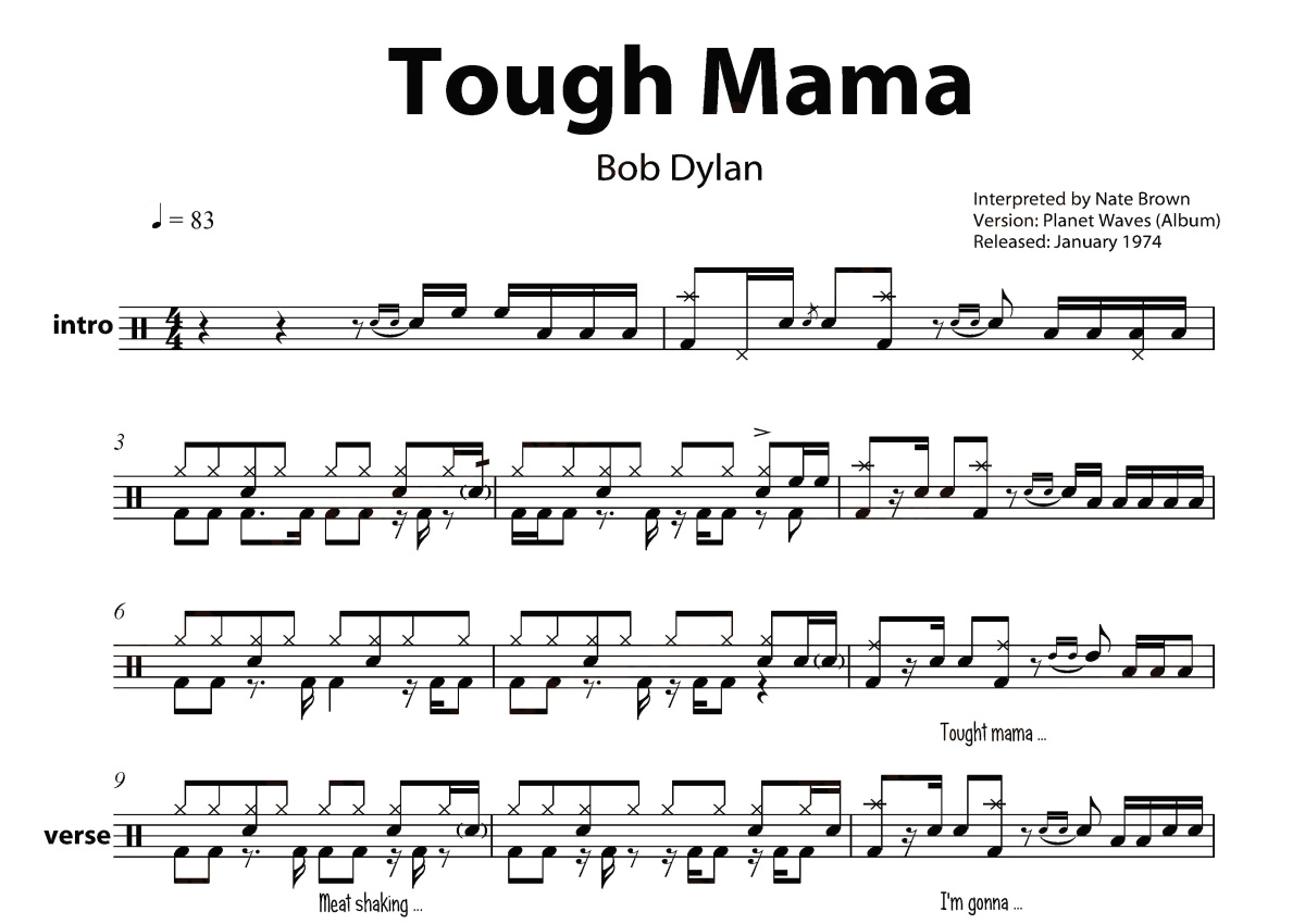 《Tough Mama》是Bob Dylan演唱的一首歌曲,这份鼓谱共有四张高清图谱,图谱由 @打鼓谱 编配上传,图谱使用五线谱编配,使用这份Tough Mama架子鼓谱,你将能够轻松地敲打出这首Bob Dylan的Tough Mama,快来尝试吧。Tough Mama was written after On a Night Like This – a song that has the same sort of upbeat, here it is, take it or leave it, charge-along and have-...。