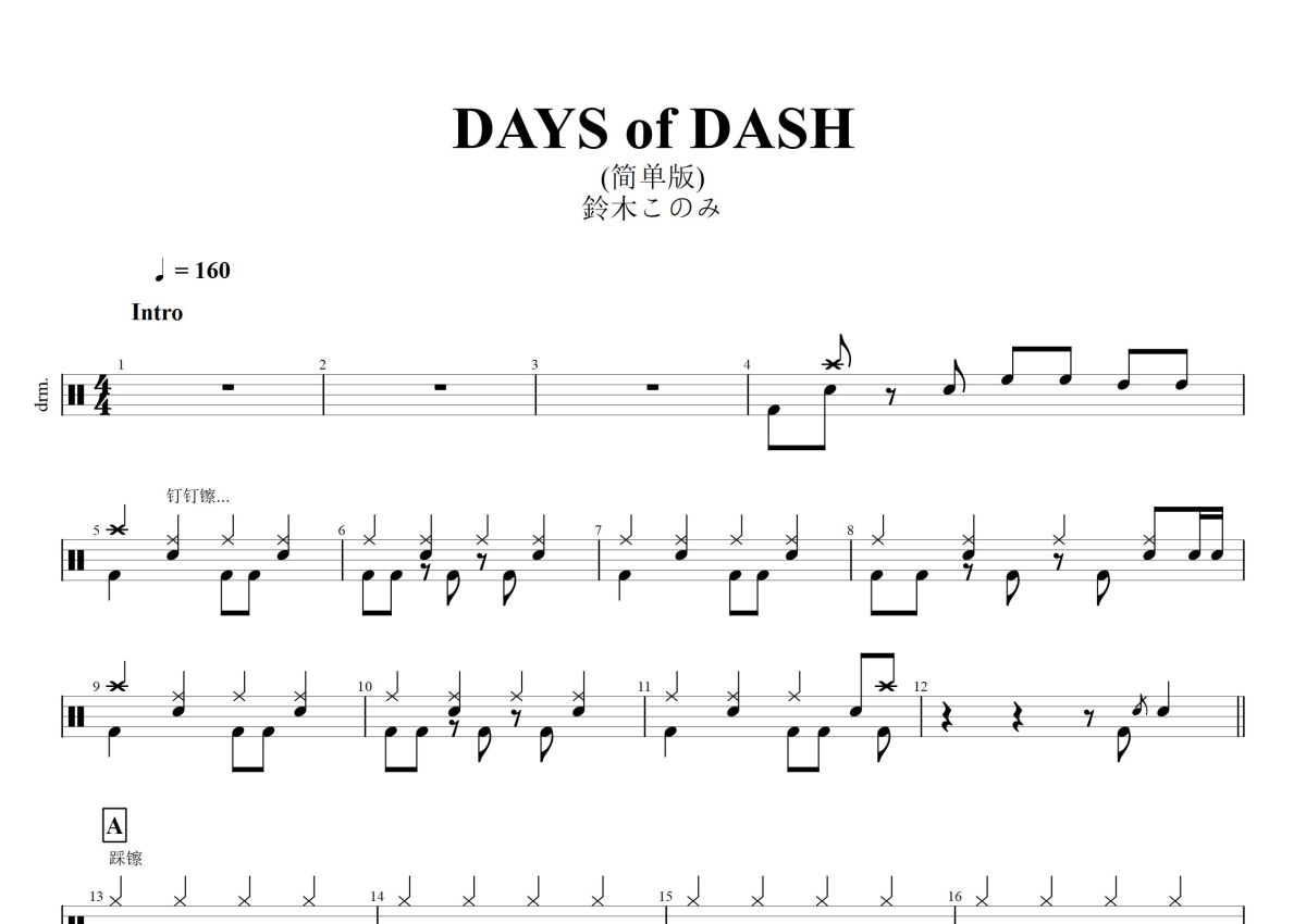 鈴木このみ《DAYS of DASH》鼓谱 - 架子鼓谱 - 简单版
