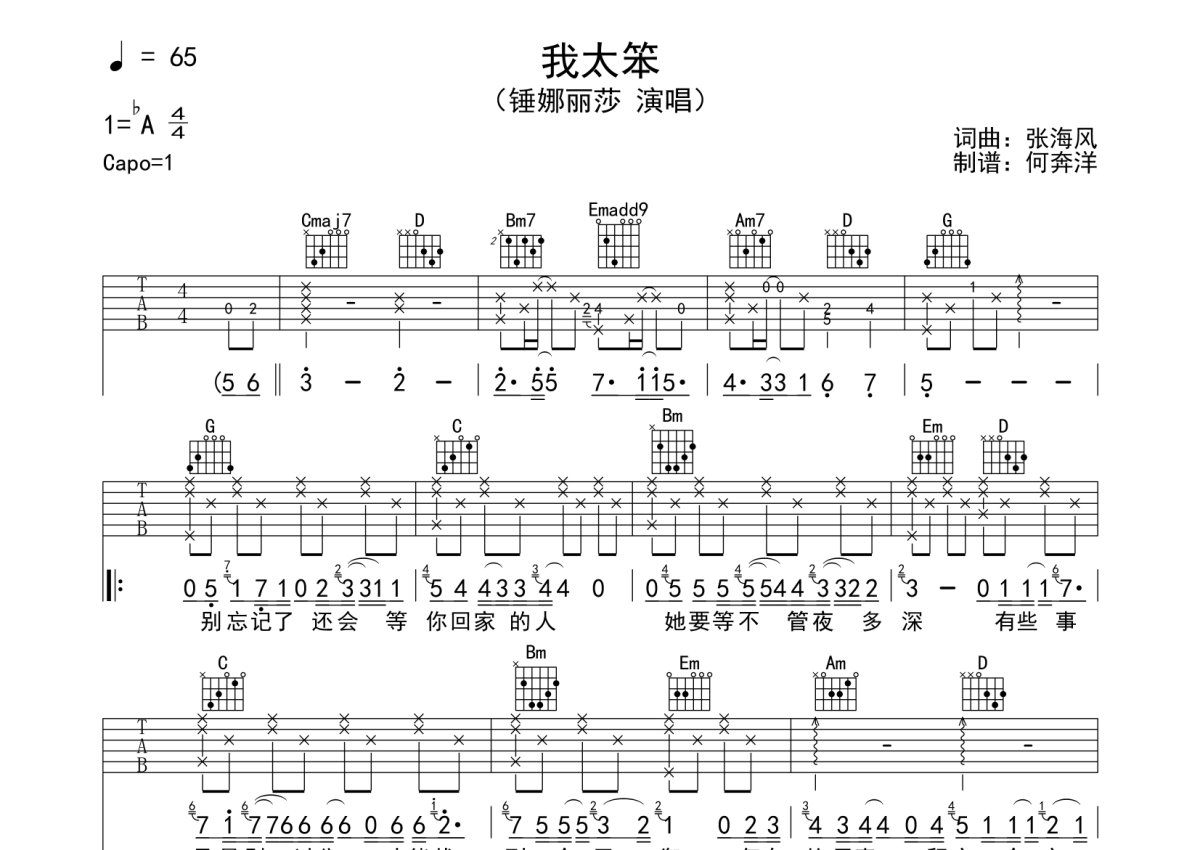 《我太笨》是锤娜丽莎演唱的一首歌曲,本吉他谱采用的是G调指法编配,这份吉他谱共有两张高清图谱,图谱由 @何奔洋 编配上传,图谱使用六线谱编配,包含吉他和弦指法、简谱以及歌词部分,曲谱配备了相关的音频提供试听,使用这份我太笨吉他谱,可以让你更加方便地掌握这首歌曲的弹唱技巧,快来尝试吧。锤娜丽莎《我太笨》吉他谱_G调吉他弹唱谱。