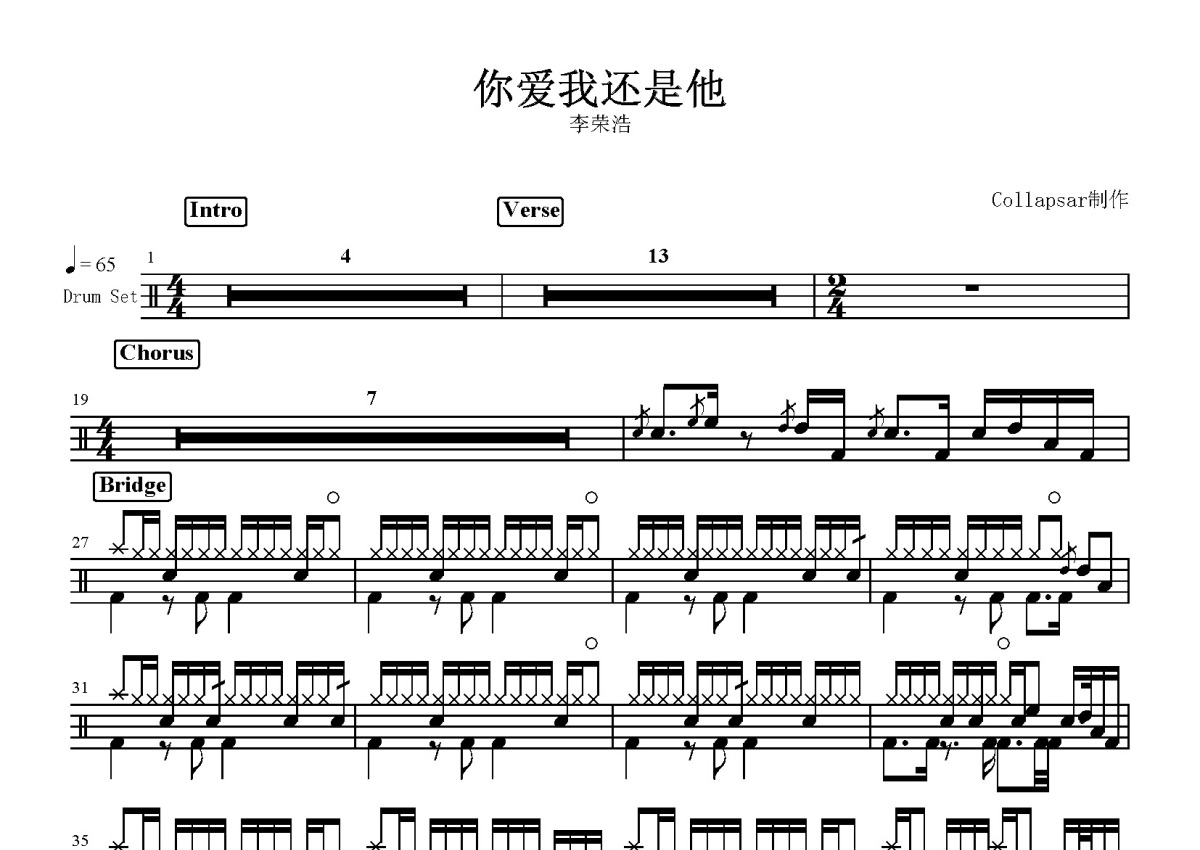 李荣浩《你爱我还是他》鼓谱 - 架子鼓谱