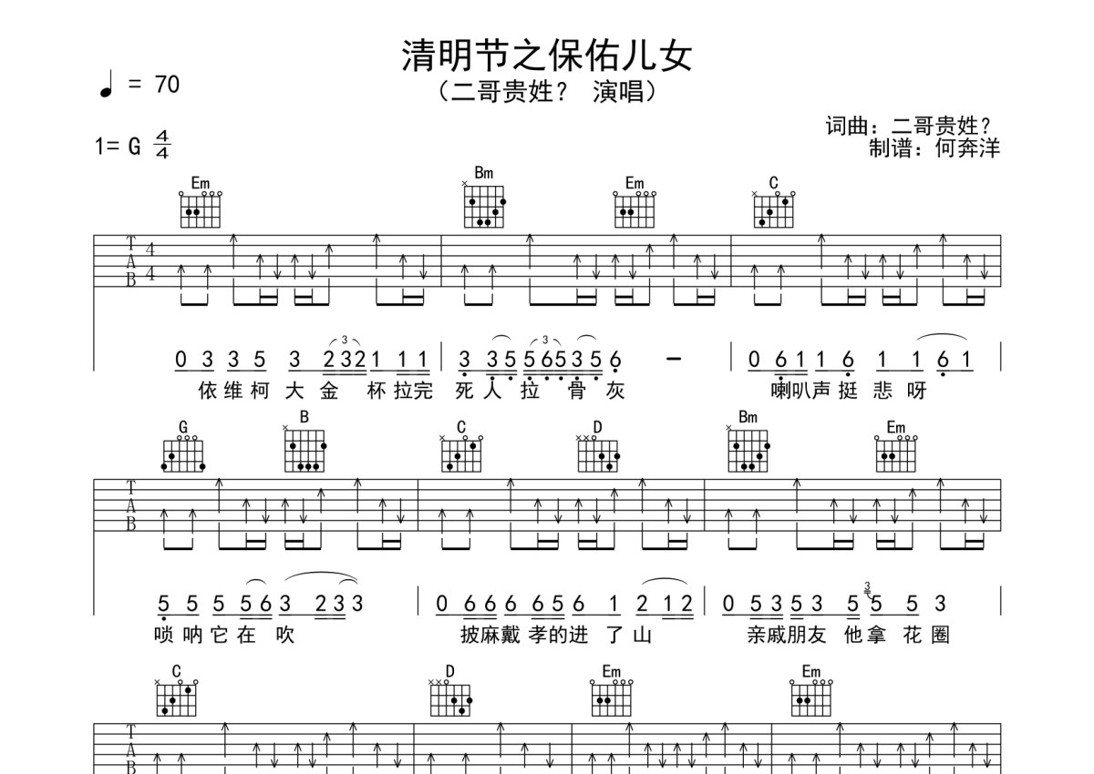 二哥贵姓《清明节之保佑儿女》吉他谱 - G调弹唱六线谱