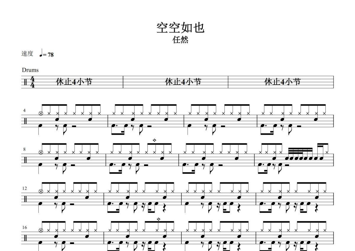 《空空如也》是任然演唱的一首歌曲,这份鼓谱共有两张高清图谱,图谱由 @打鼓谱 编配上传,图谱使用五线谱编配,使用这份空空如也架子鼓谱,你将能够轻松地敲打出这首任然的空空如也,快来尝试吧。《空空如也》是任然原唱的歌曲,雪无影作词、作曲,于2017年12月28日发行 。